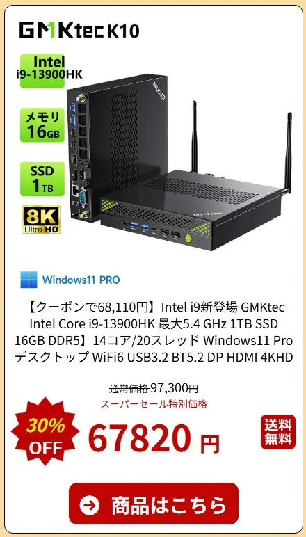 数多くのPC関連商品を手掛けるメーカー「GMKtec」(中国)は、Intel Core i9-13900HKを搭載したミニPC『GMKtec K10』を販売している。 CPUには「Intel Core ...
