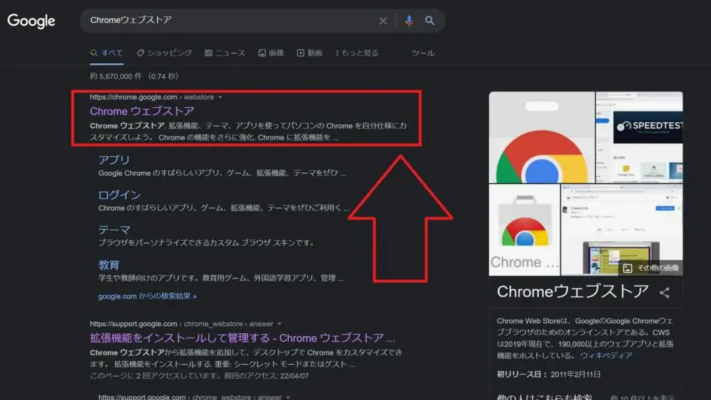▼まずは、ブラウザから「Chromeウェブストア」と検索してアクセスしましょう。