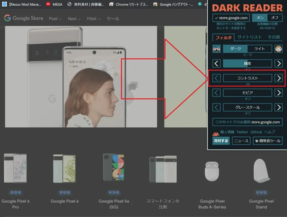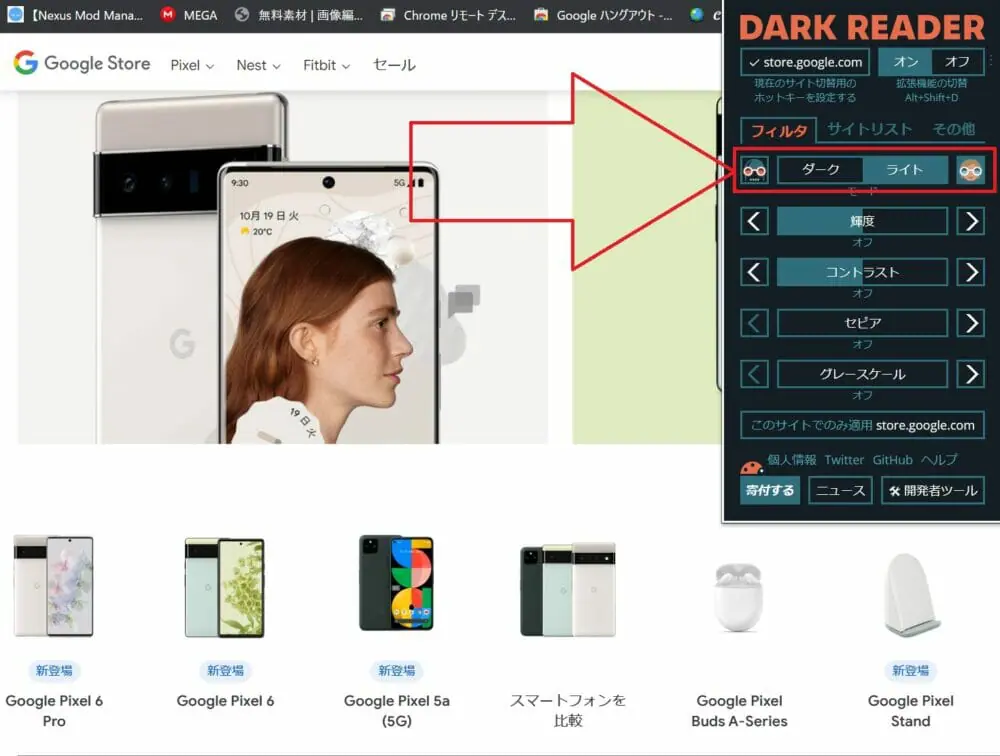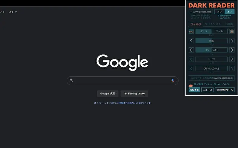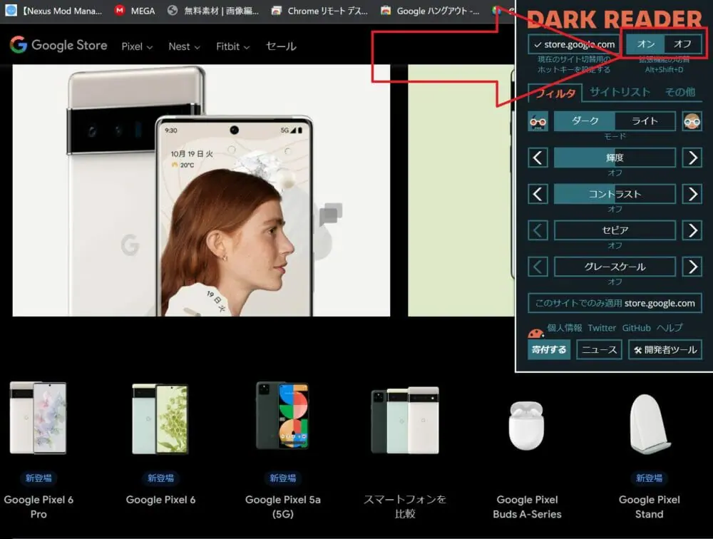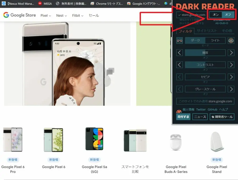 画面赤枠の部分を操作すると、『Dark Reader』の機能をオン/オフを切り替えられます。