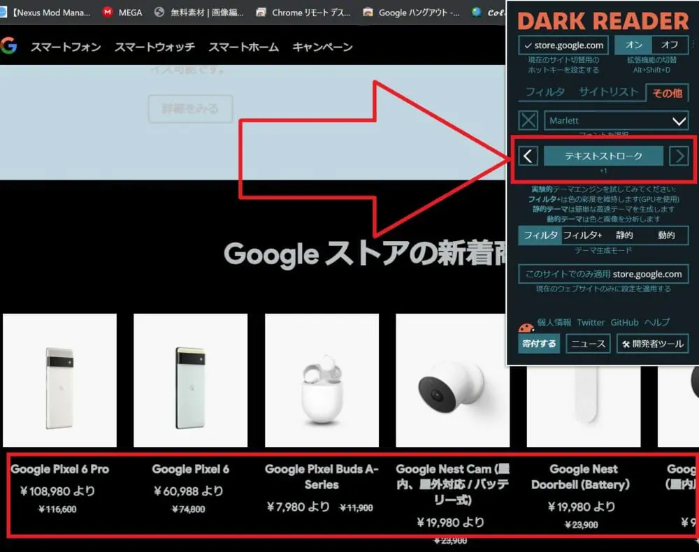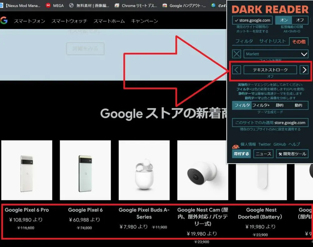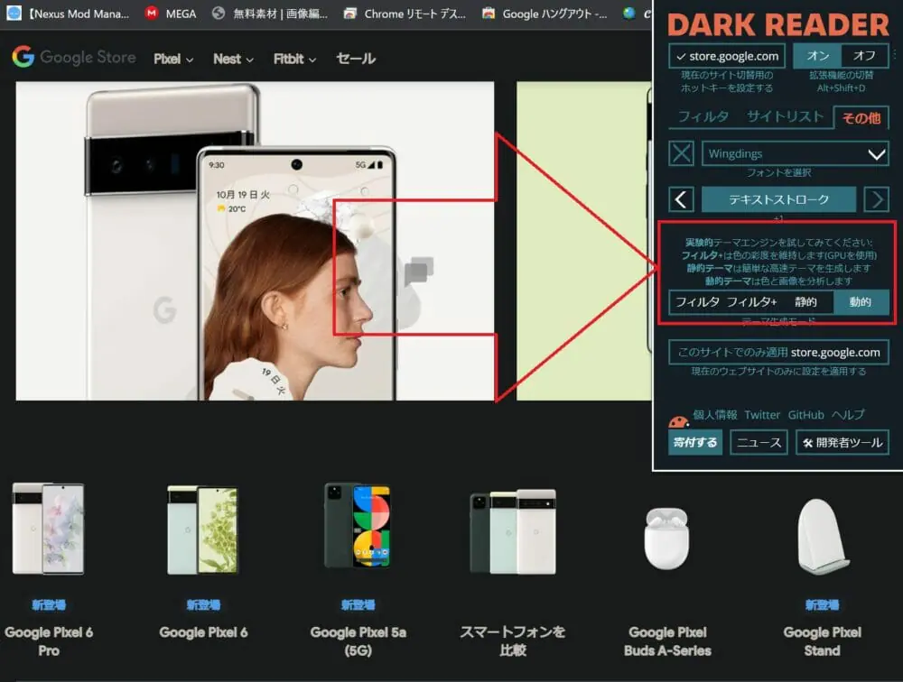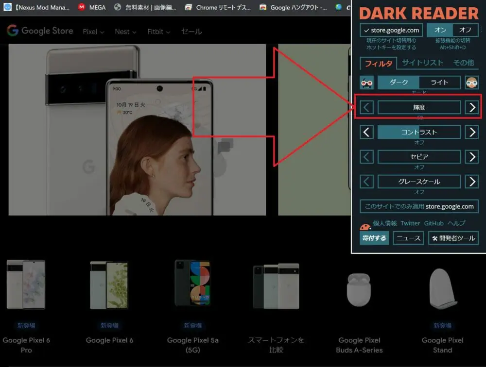 画面赤枠の部分を操作すると、『Dark Reader』の機能をオン/オフを切り替えられます。