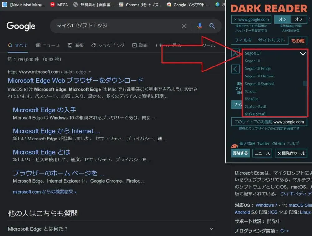 ▼同様の手順でMicrosoft Edgeなどにも、『Dark Reader』を追加できます。