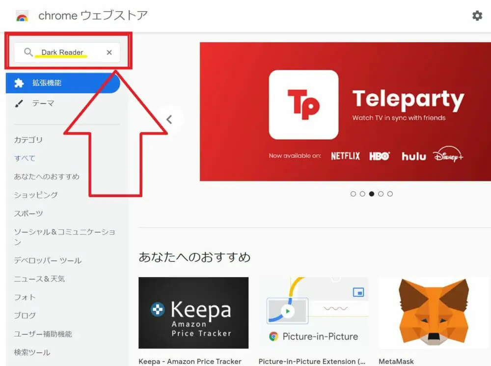 ▼「Chromeウェブストア」にアクセスしたら、左上の「拡張機能を検索」で『Dark Reader』と入力して、「Enterキー」を押してください。