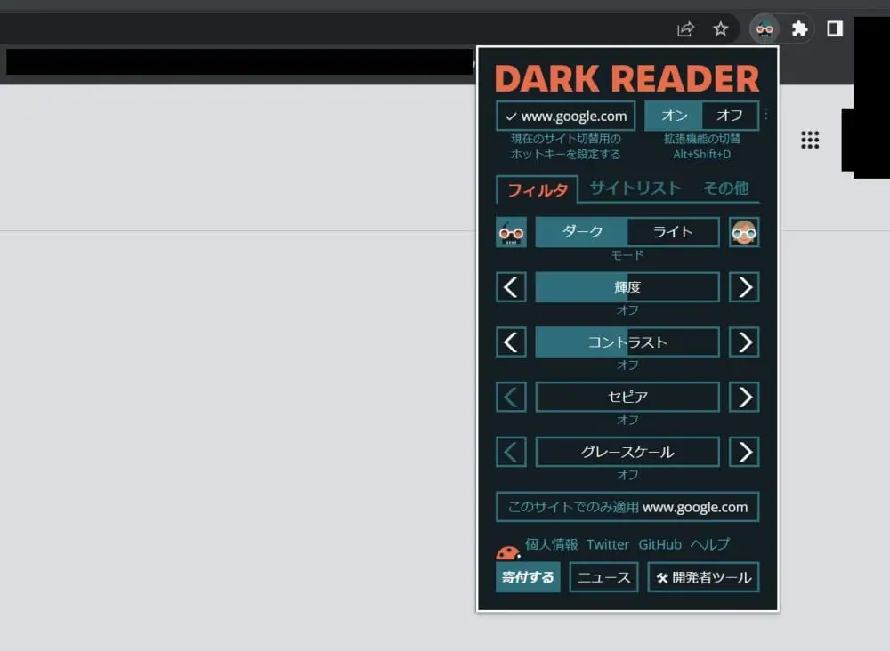▼ブラウザ右上のジグソーアイコンをクリックして、拡張機能内の『Dark Reader』をクリックすると、操作パネルが出てきます。