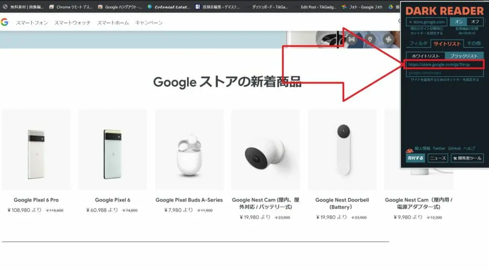 ▼ブラックリストの枠内に、『Dark Reader』を無効にしたいウェブサイトのURLを入力してください。