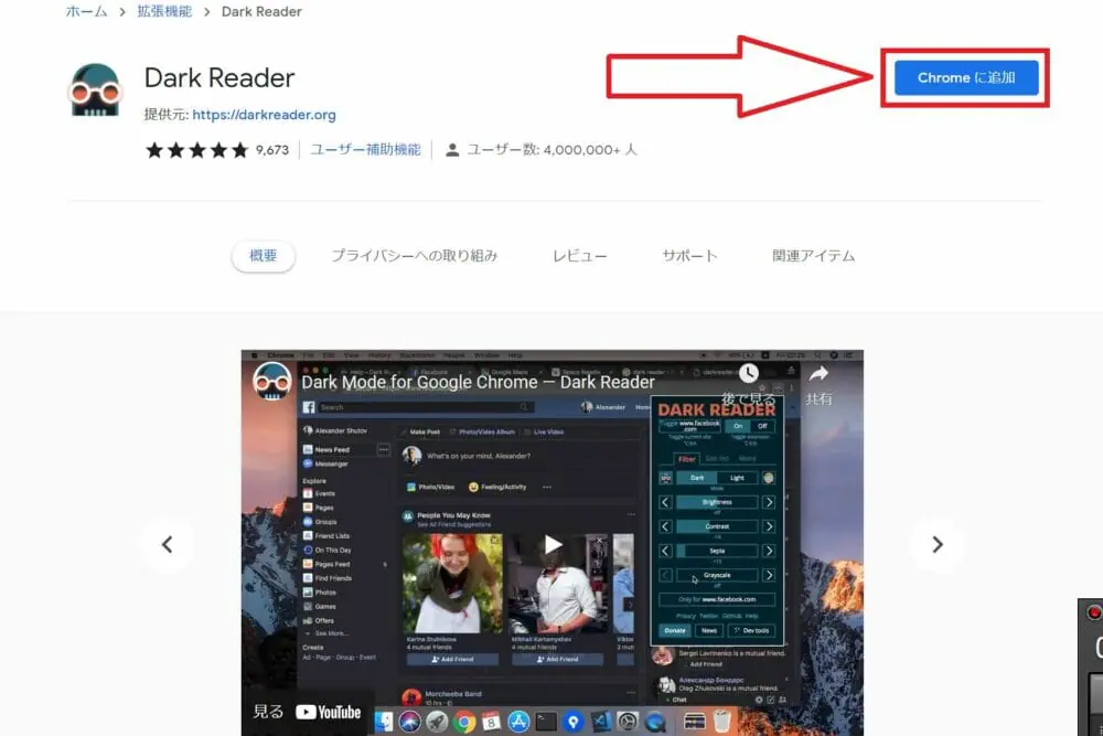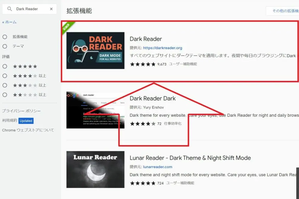 ▼検索欄の一番上に、『Dark Reader』が出てくるのでクリックしてください。