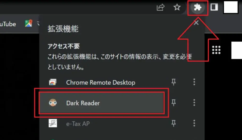 ▼最後に、ブラウザ右上のジグソーアイコンをクリックして、拡張機能内に『Dark Reader』があれば追加完了です。