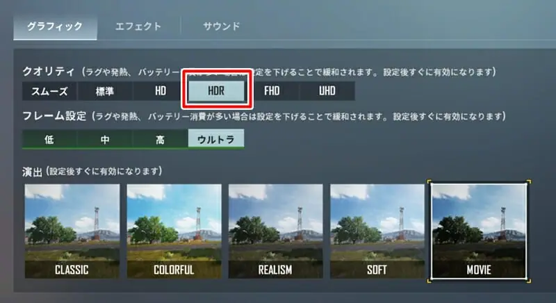 まずグラフィッククオリティに関しては『HDR』までを選択することが出来た。
