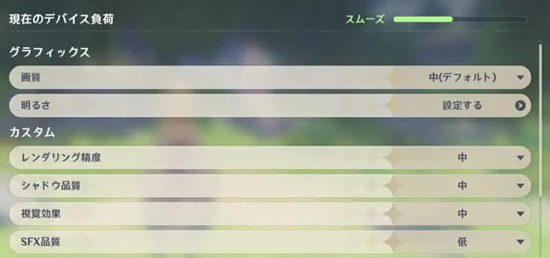 ▼画質設定はデフォルト状態で "中" に設定されており、デバイス負荷は "スムーズ" の状態。