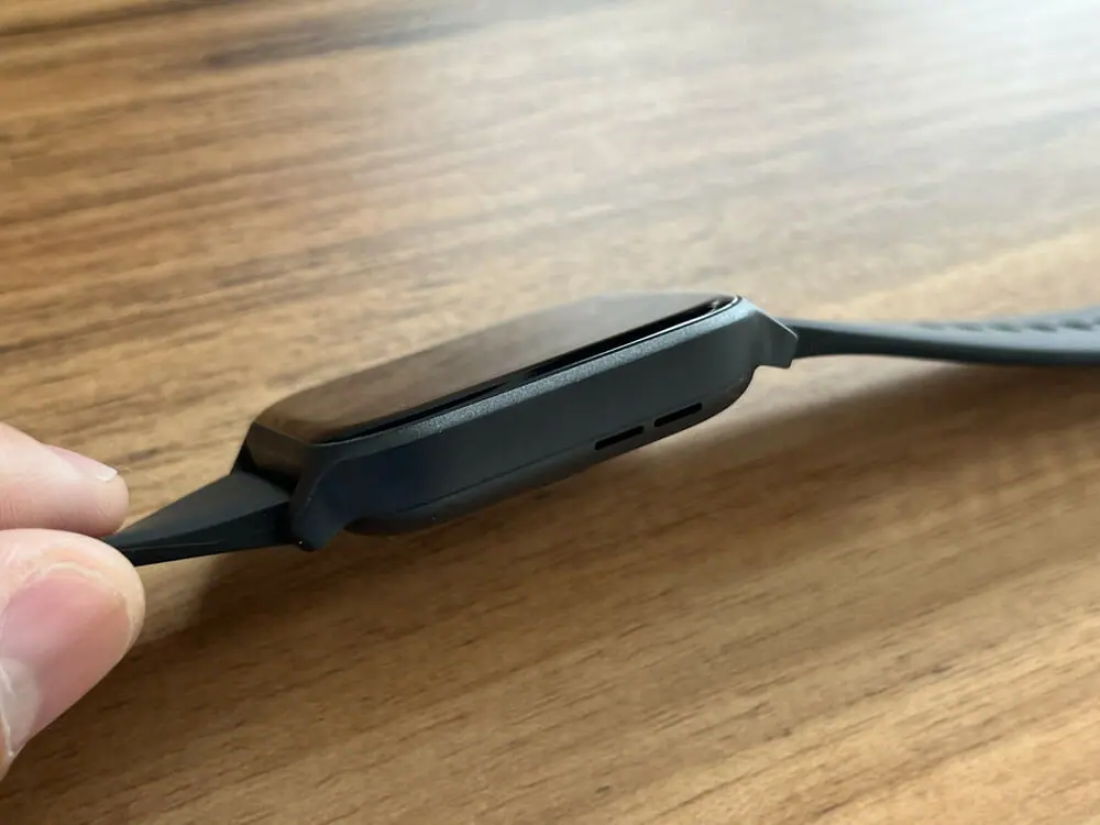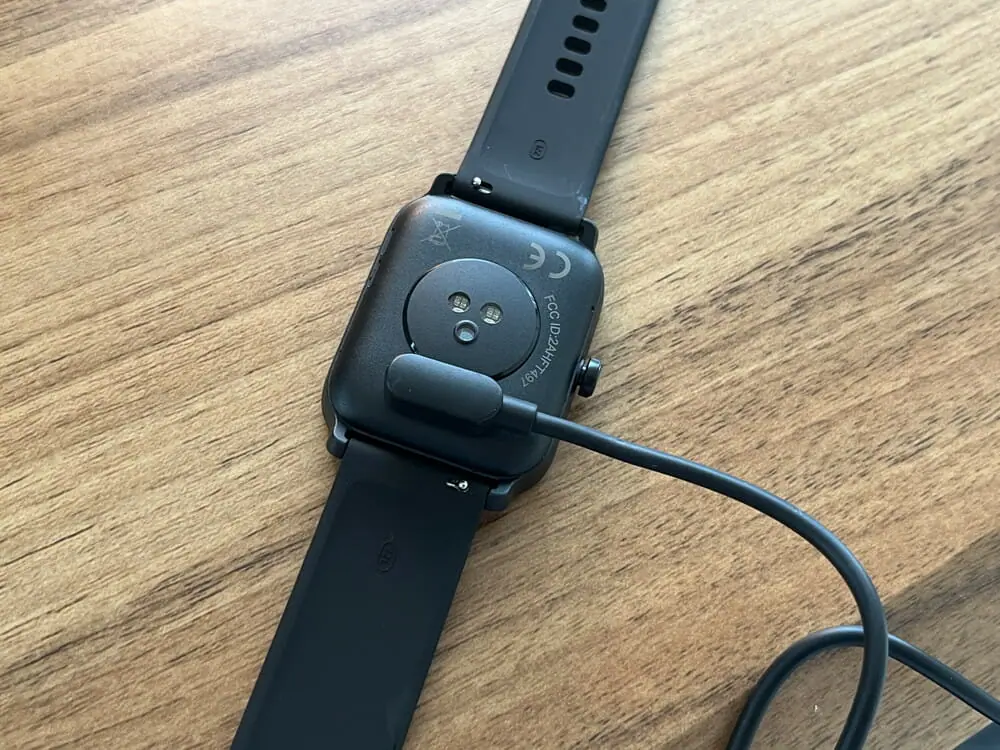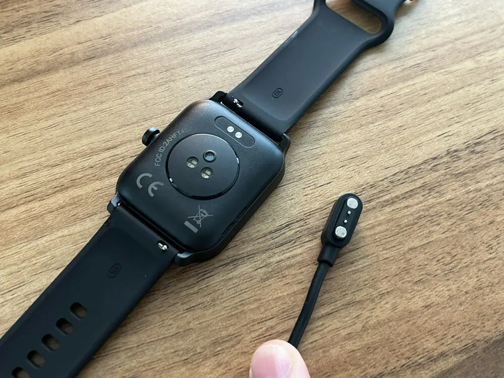 充電の際は、スマートウォッチ背面のポートにケーブル端子を近づけるだけでカチッと磁石で吸着し、充電が開始される。