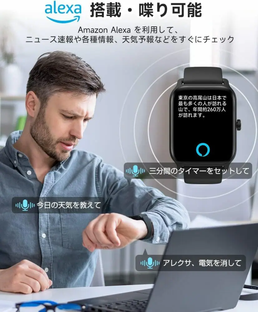 マイク&スピーカー内蔵で、スマートウォッチ上から音声通話が可能。Alexa(アレクサ)にも対応しており、音声でさまざまな機能を利用出来る点も嬉しい。