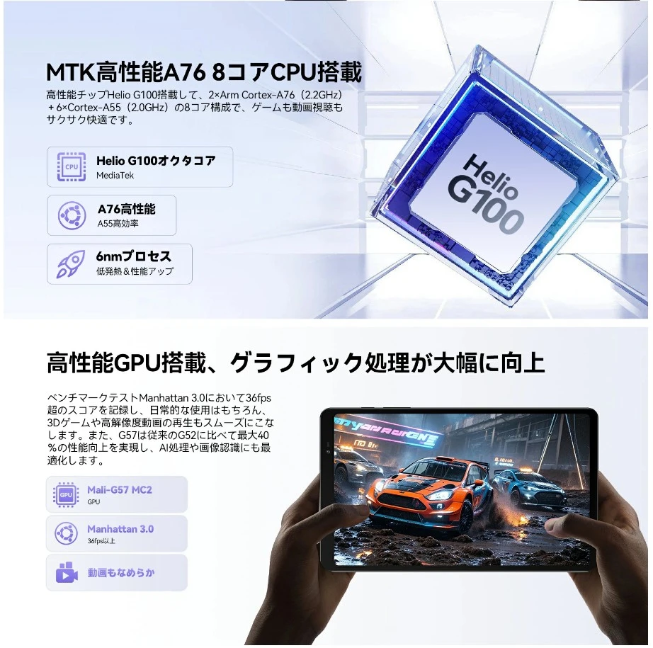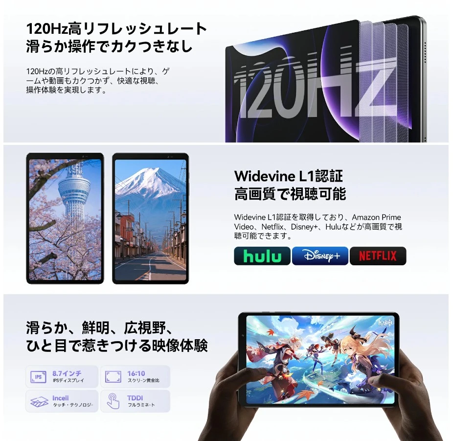 8.7インチの扱いやすいサイズ感に加え、120Hz高リフレッシュレートディスプレイ、Helio G100プロセッサ、最大24GBメモリ構成、4G LTE対応など、日常用途からエンタメ用途までしっかりカバーするスペックを搭載。