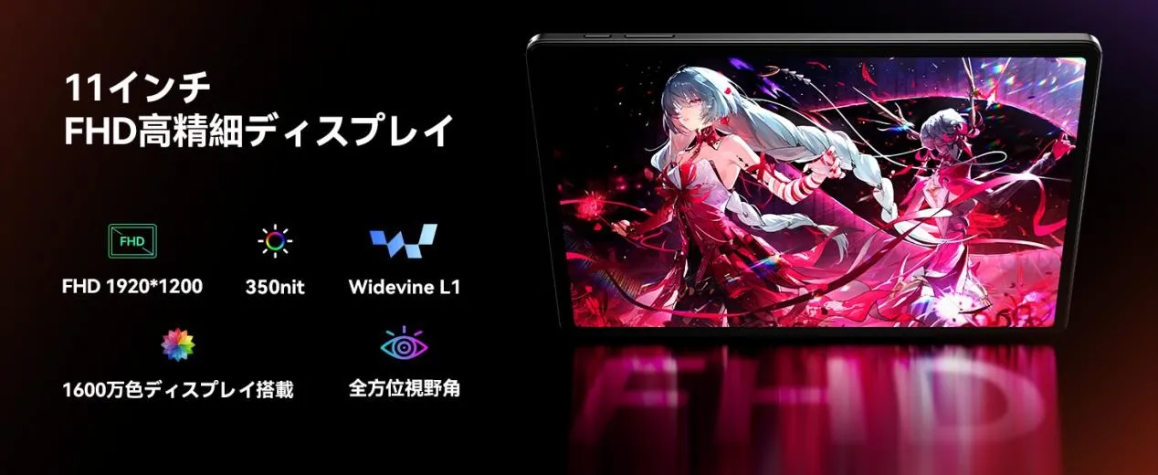 本製品は、Android 16搭載の11インチタブレットです。FHDディスプレイ搭載、Widevine L1対応、8,000mAh大容量バッテリー内蔵、最大24GBメモリによる快適な動作など、日常使いに十分なスペックを備えています。