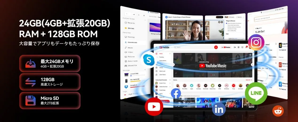 CPU(SoC)には「UNISOC T615 オクタコアプロセッサー」および4GB物理 + 20GB仮想RAMにより、ウェブサイト閲覧や動画視聴など、日常作業をスムーズにこなせる性能を備えています。
