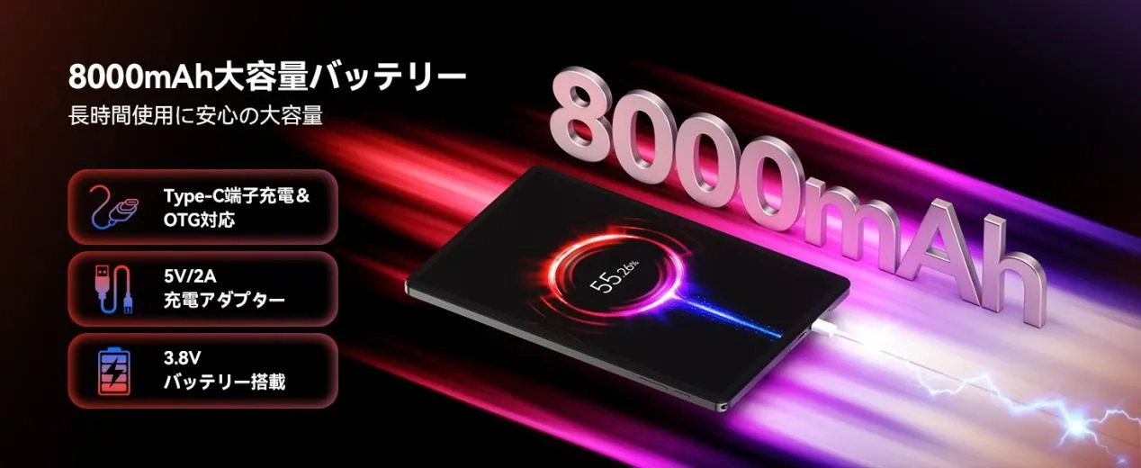 そして8,000mAh大容量バッテリーを内蔵。外出先でも長時間の連続使用が可能です。