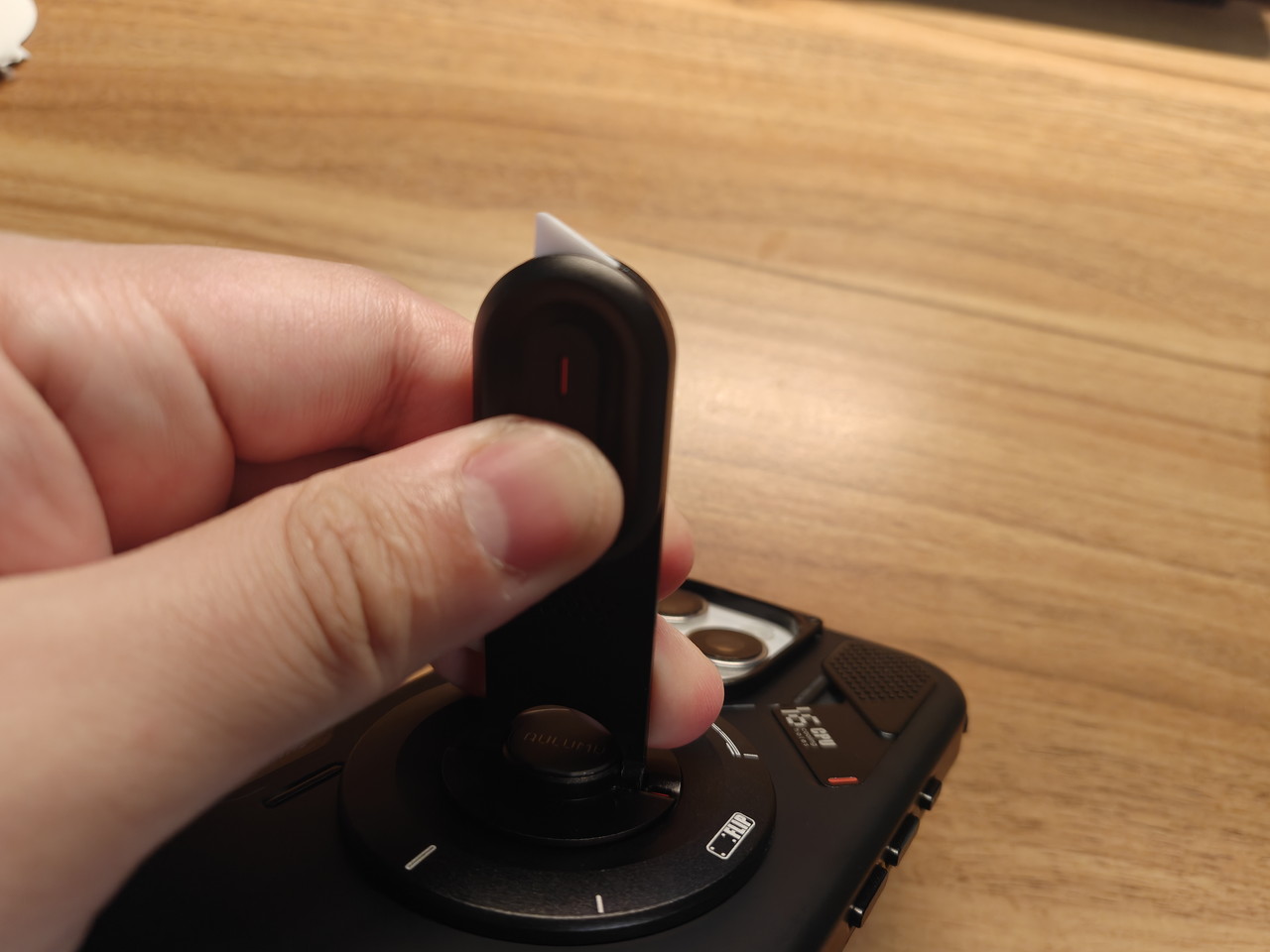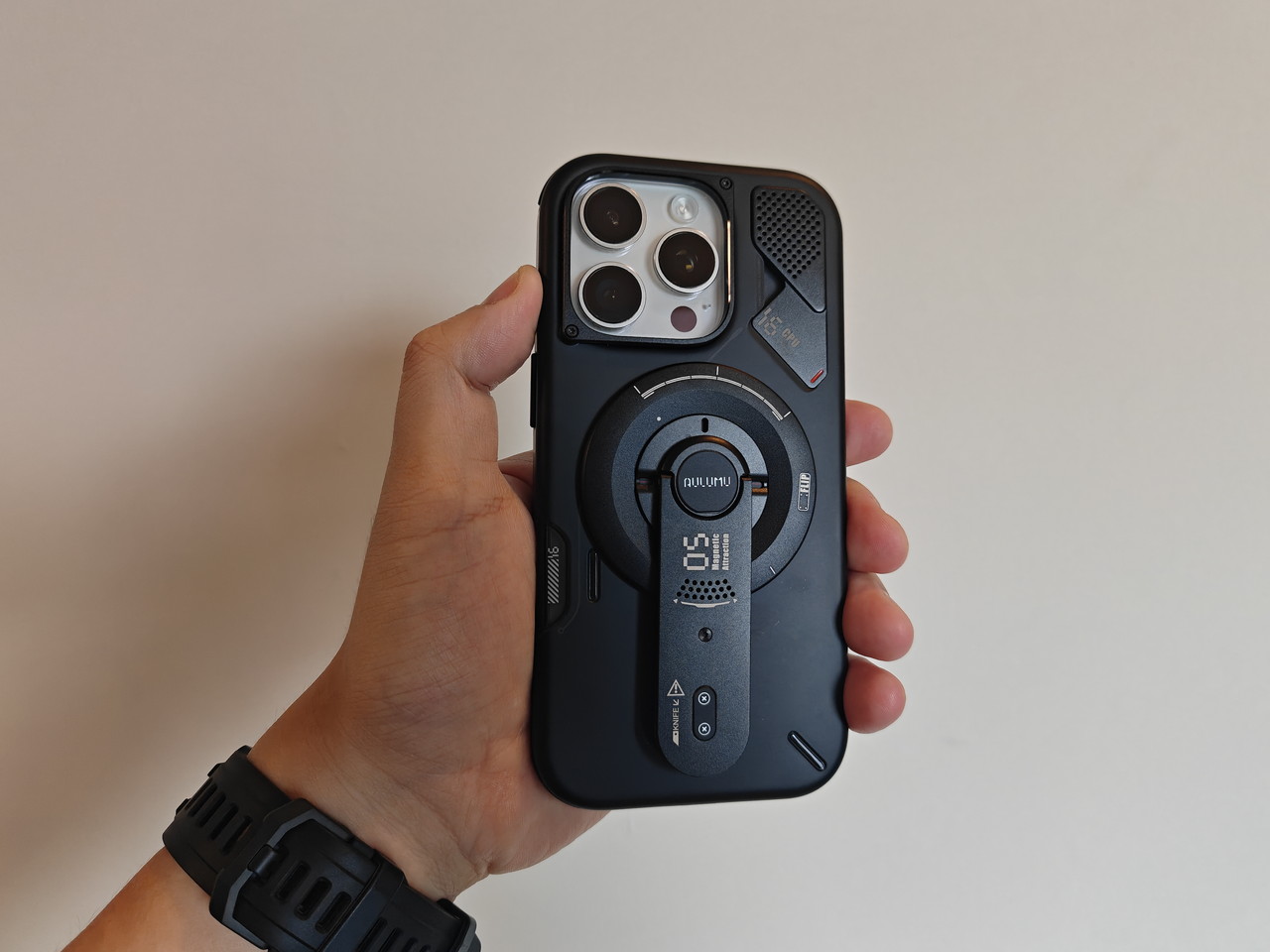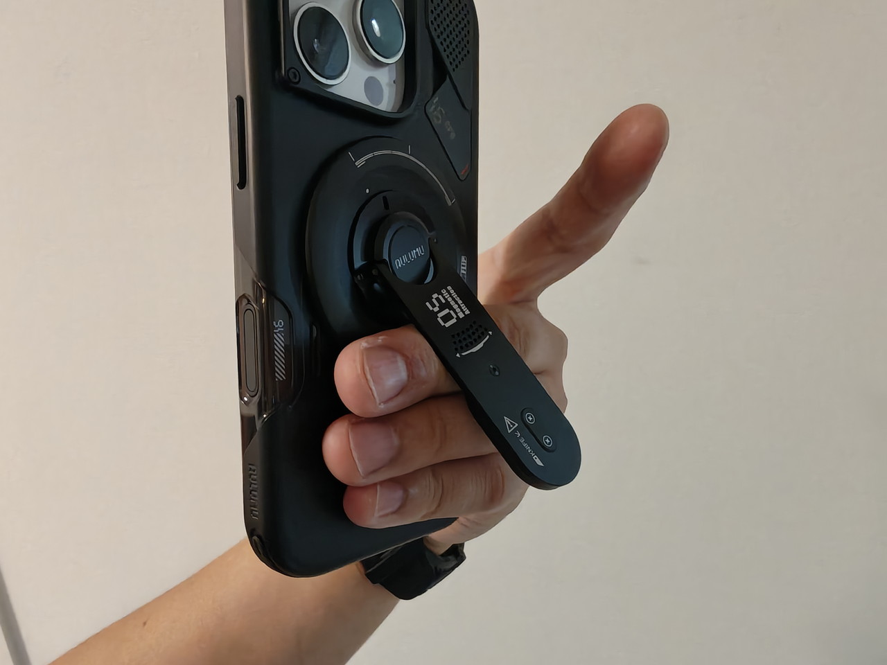 Aulumu G05 Airをスマホ背面に近づけると、MagSafe部分にピタッと吸い付くように固定されます。吸着力は強力で、グリップ部分を摘まんで激しく揺らしても外れる気配がありませんでした。