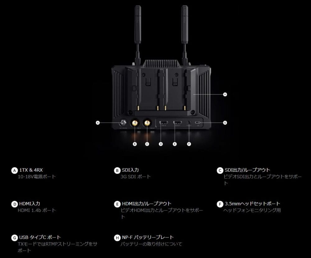 | インターフェース | ・1TX & 4RX ・SDI入力 ・SDI出力/ループアウト ・HDMI入力 ・HDMI出力/ループアウト ・3.5mmジャック ・USB Type-Cポート ・NP-F バッテリープレート |