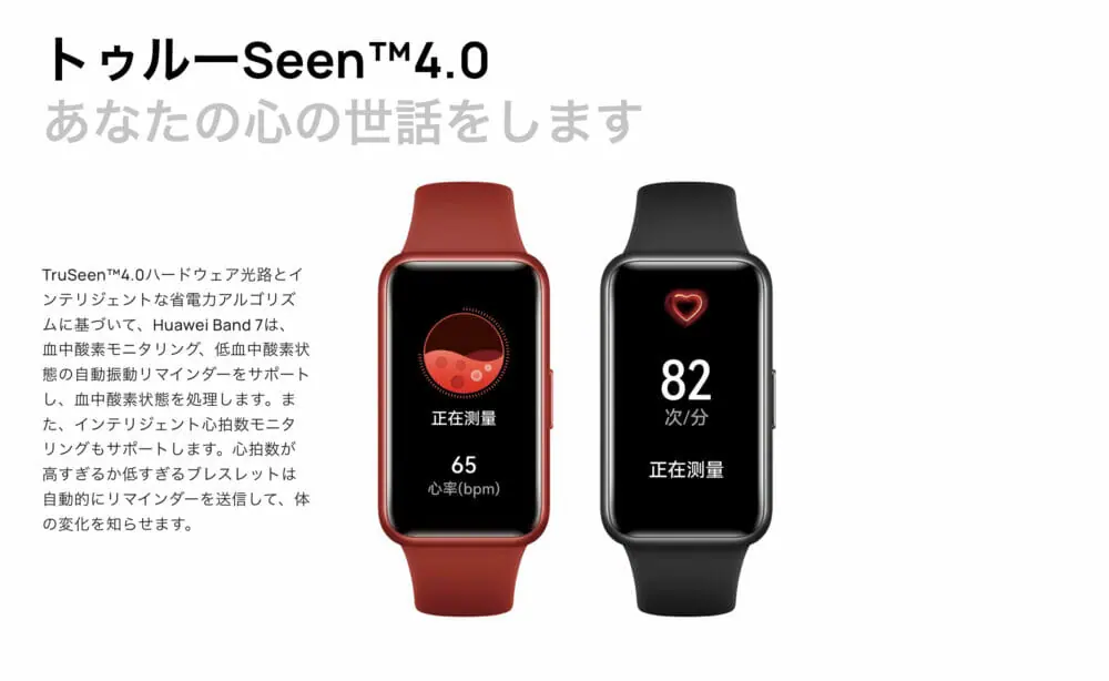 ▼心拍数や血中酸素濃度計測機能もBand6同様のTruSeen4.0が採用されています。