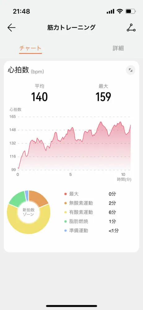 ▼トレーニング中の心拍数変化も記録されています。