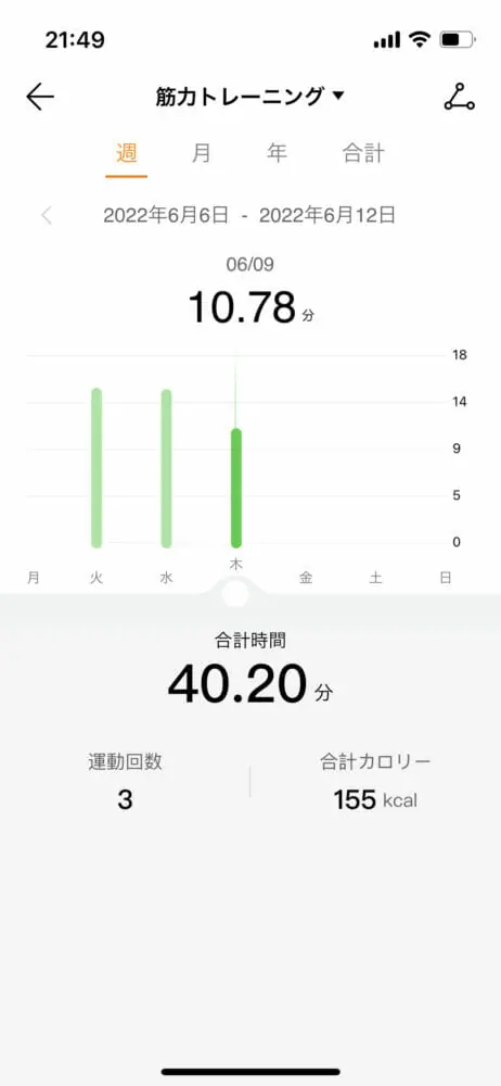 ▼ワークアウト記録はアプリにも同期され記録を振り返ることができます。記録を可視化することはモチベーション管理にもいいですね。