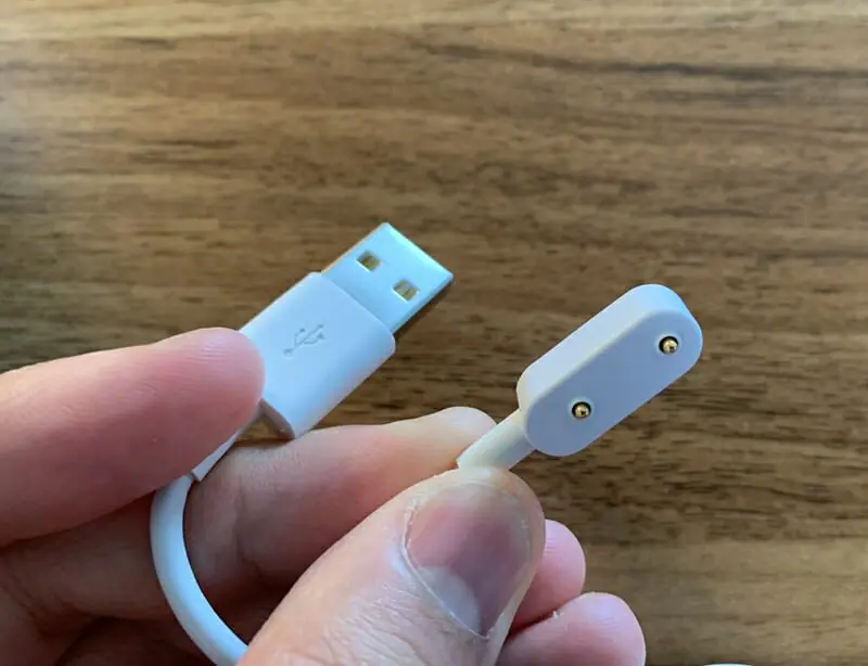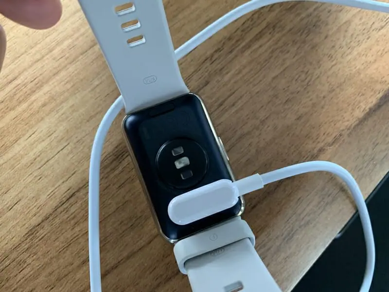 充電の際は、スマートウォッチ背面のポートにケーブル端子を近づけるだけでカチッと磁石で吸着し、充電が開始される。