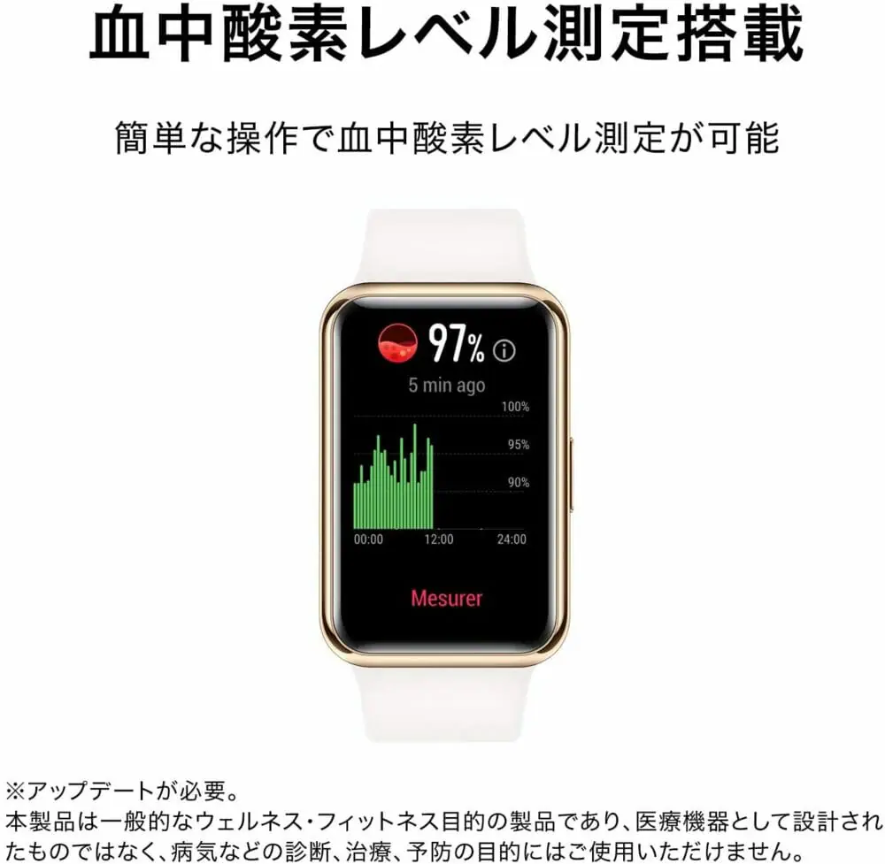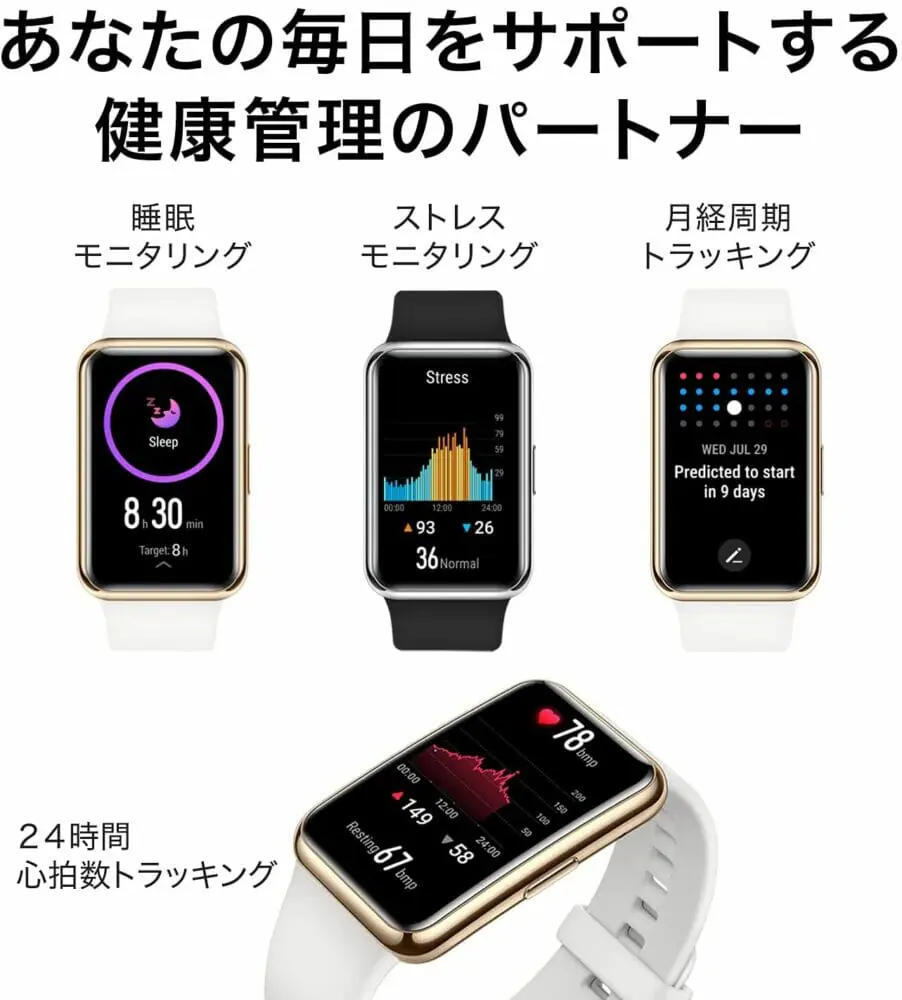 | 主な機能 | 血中酸素レベル測定 運動の記録 睡眠モニタリング 24時間心拍数トラッキング 生理管理 アラーム カレンダーイベント リマインダー メッセージ通知 等 |