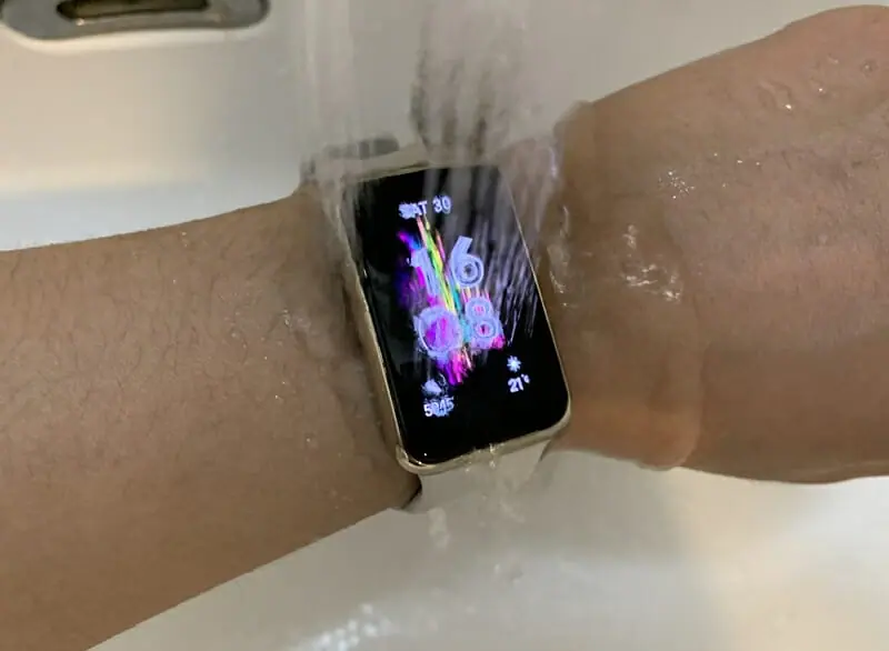 スマートウォッチ自体は5ATMの防水規格に対応しており、シャワー中やプールでの水泳中に装着し続けることもできる。