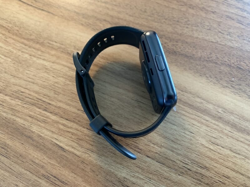 ▼スマートウォッチ本体の外観。縦46 mm x 横33.5 mm x 厚さ10.8 mmのコンパクトな筐体に、1.74インチの大きくなったタッチディスプレイが搭載されている。