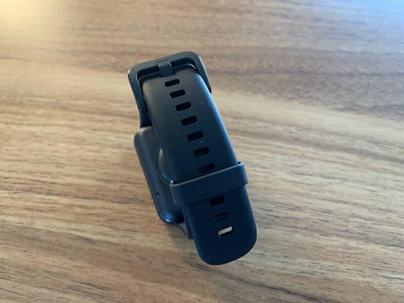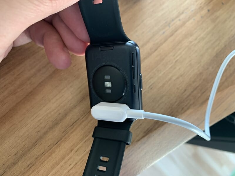 充電の際は、スマートウォッチ背面のポートにケーブル端子を近づけるだけでカチッと磁石で吸着し、充電が開始される。