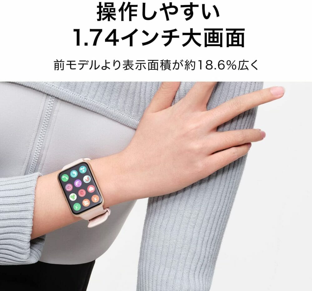 ▼1.64インチの大きめなディスプレイを搭載した『HUAWEI Watch FIT Elegant』に引けを取らないディスプレイの大きさだ。