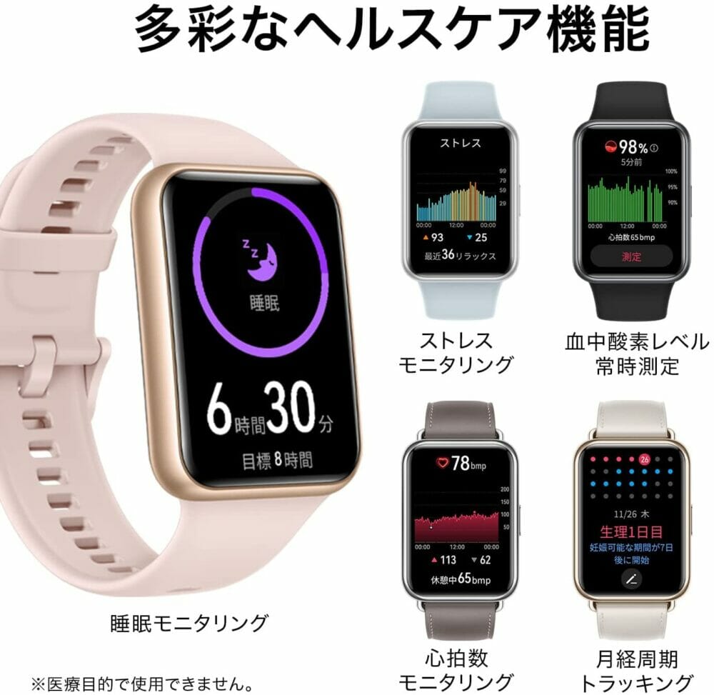 | 主な機能 | 血中酸素レベル測定 通話・メッセージ確認 音楽再生 運動の記録 睡眠モニタリング 24時間心拍数トラッキング 生理管理 音楽再生 アラーム 各種通知 等 |