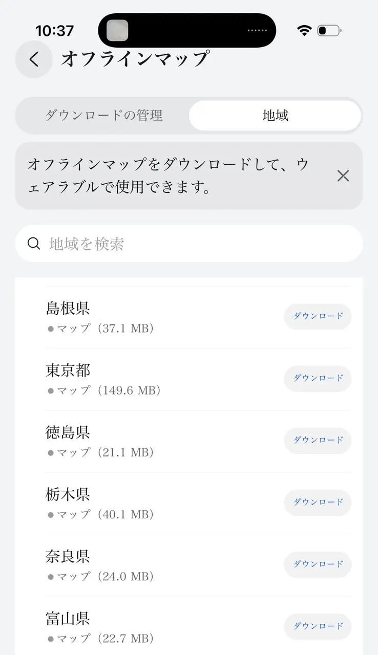 マップデータはアプリ経由でダウンロード可能。現在地のほか、日本全国、果ては世界各国のマップをダウンロードできます(もちろん広域になるほど容量も大きくなります)。