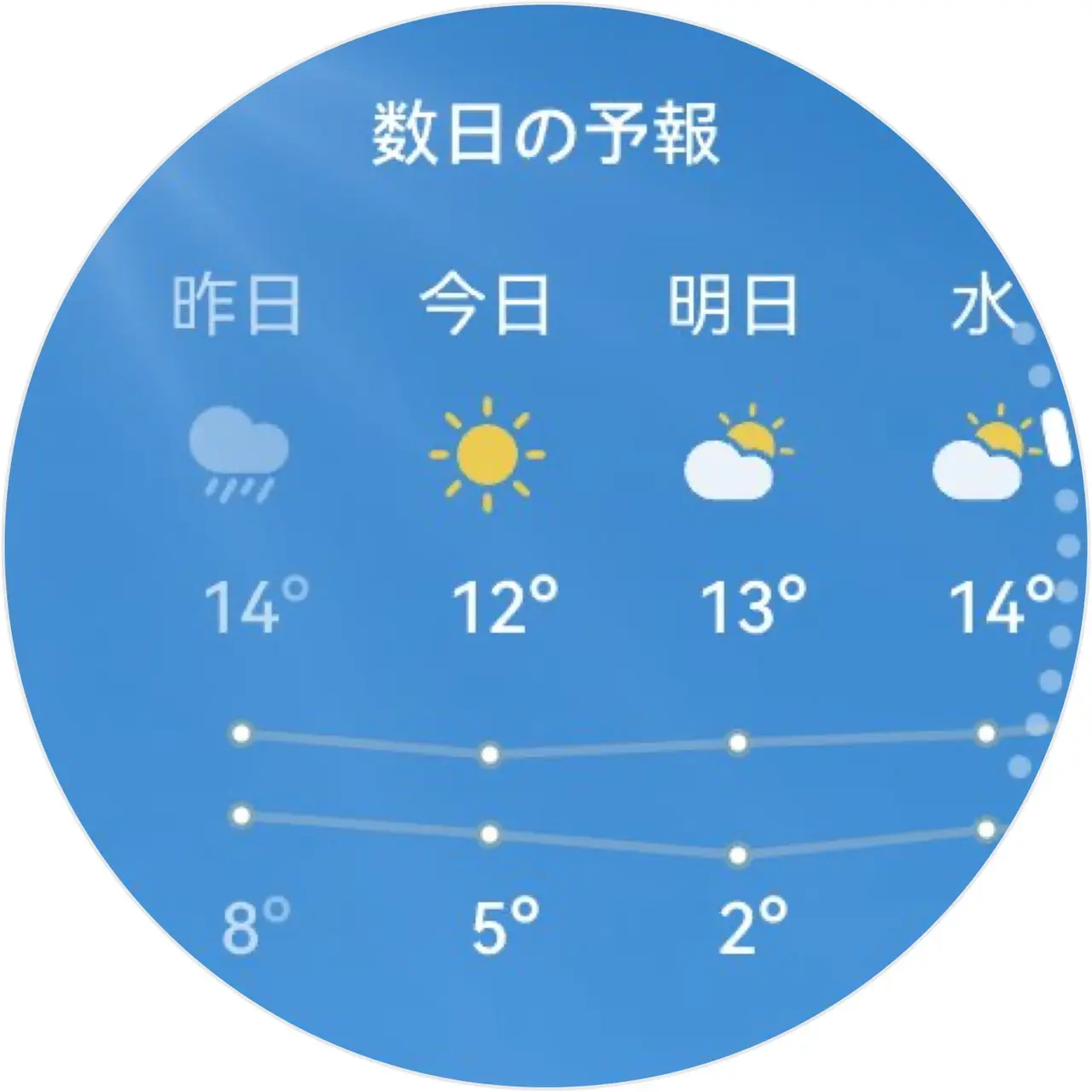 ▼GPS機能を利用して、現在地のリアルタイムの天気、週間天候情報、紫外線レベル、風速、湿度などの情報を詳細に確認できます。