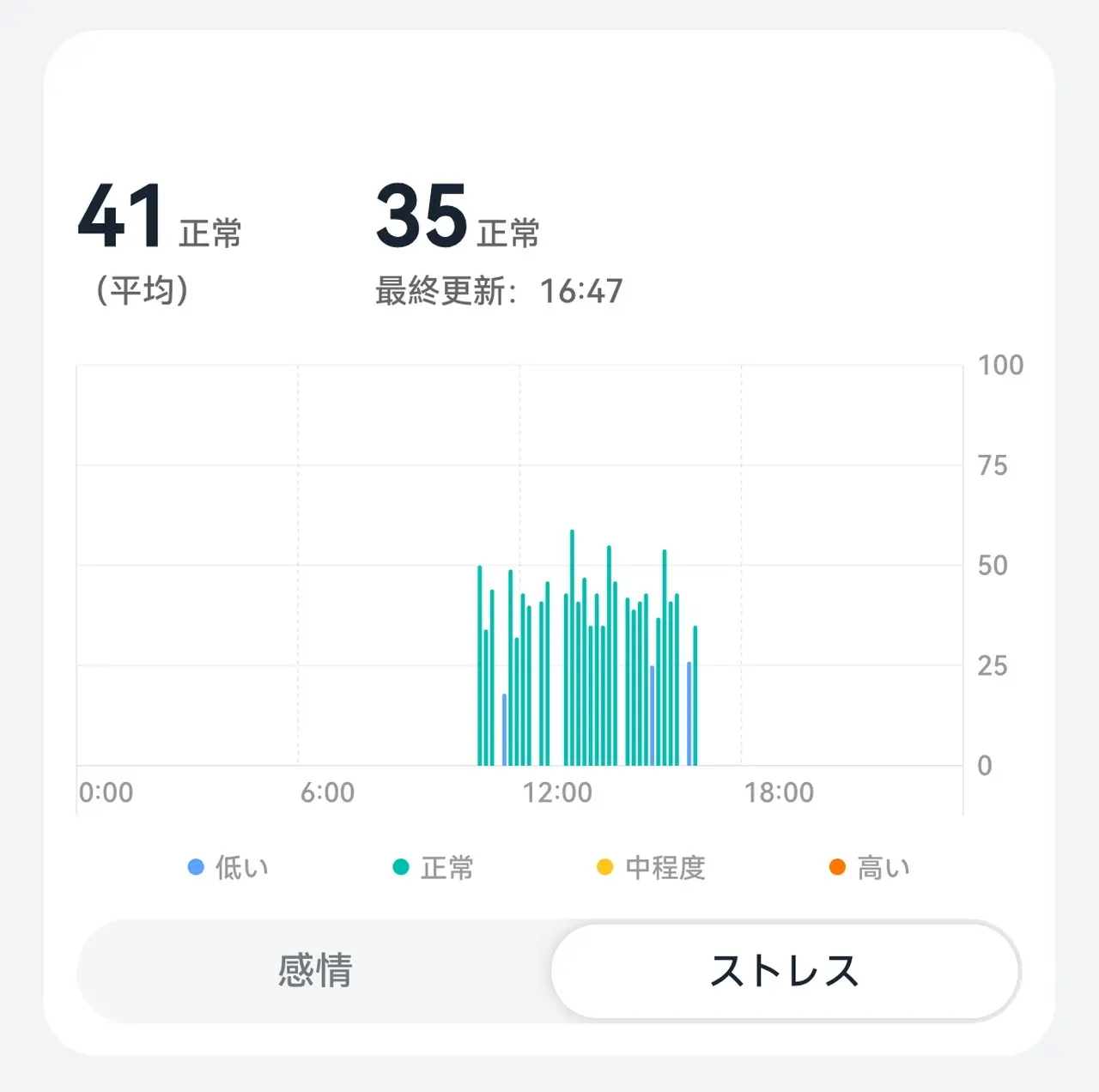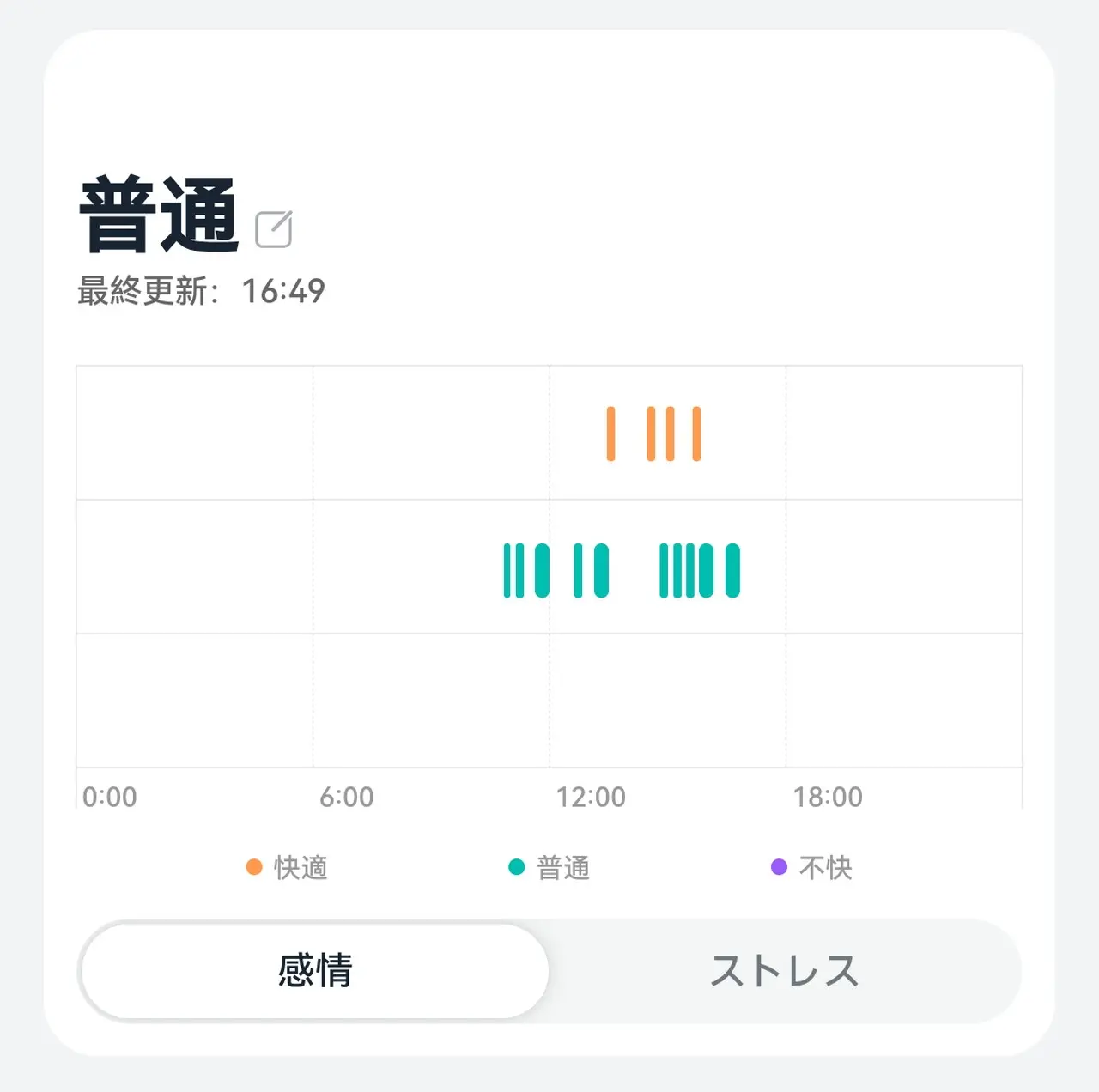 ▼数十分刻みで感情やストレスの変化を記録し、グラフとして振り返ることができるため、日々の行動や生活リズムと照らし合わせて、自分のコンディションの傾向を見直す際の参考にしやすいです。