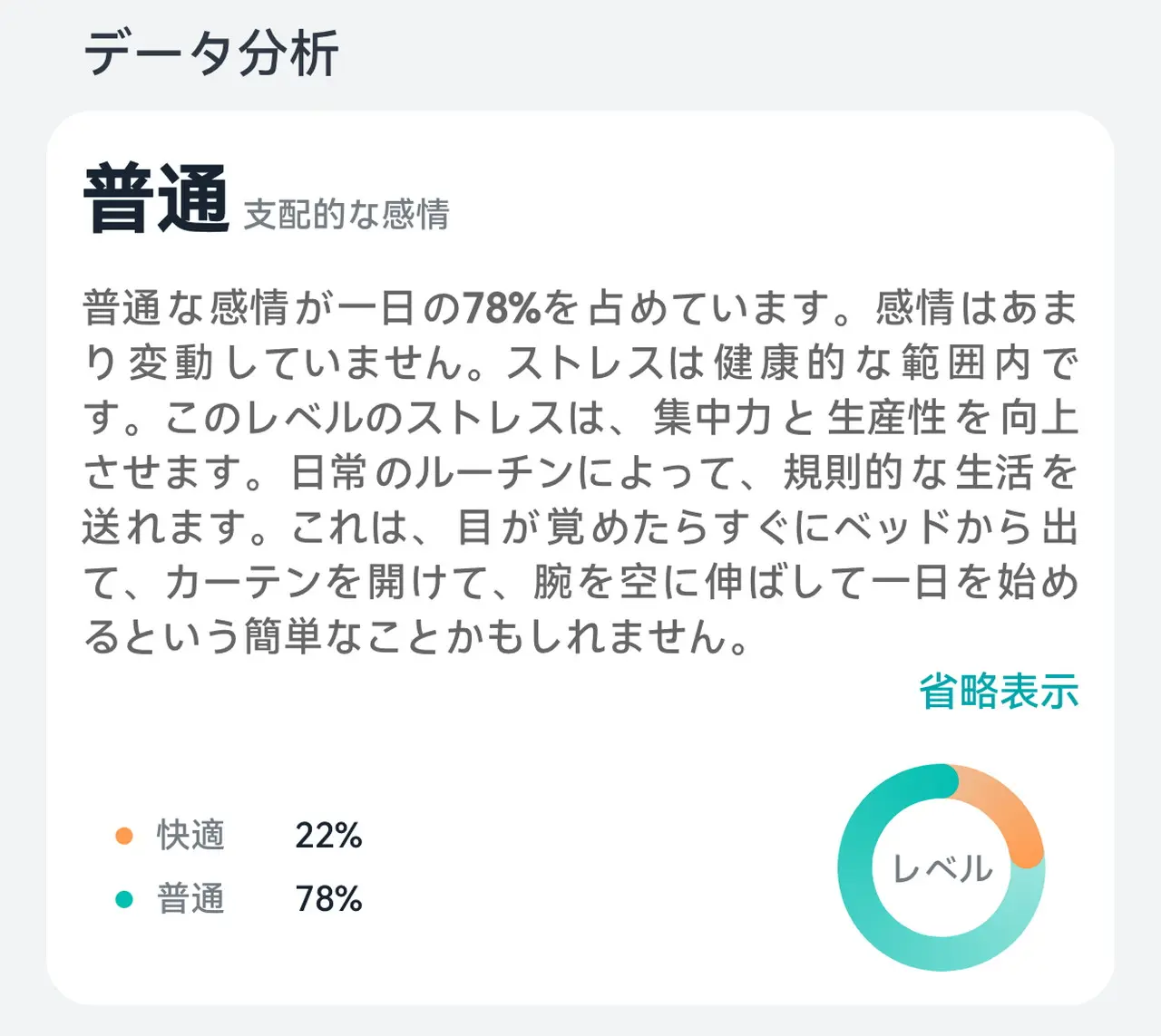 また、計測データを基にAIが分析を行い、コメントを提供する機能も用意されています。自身の情緒を文章化してくれるのは嬉しい機能と感じました。