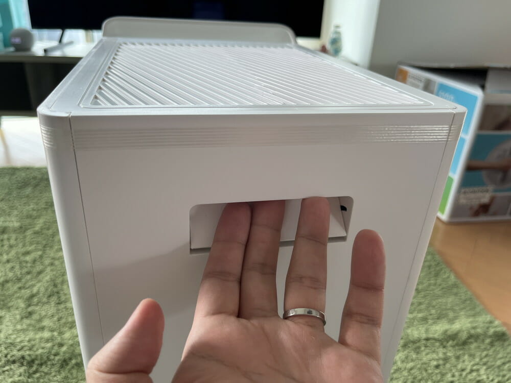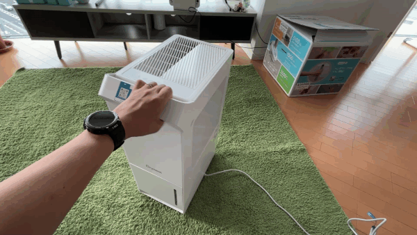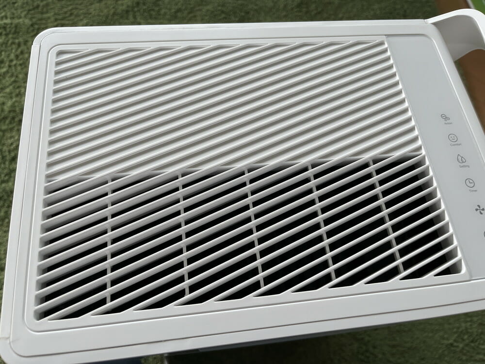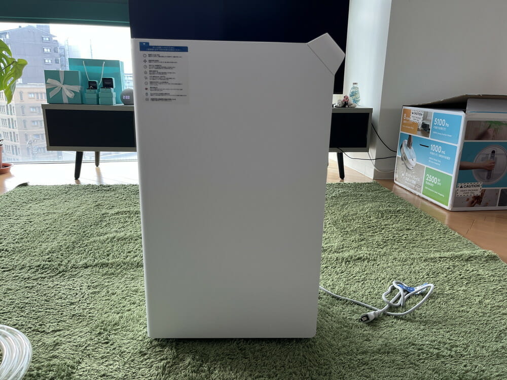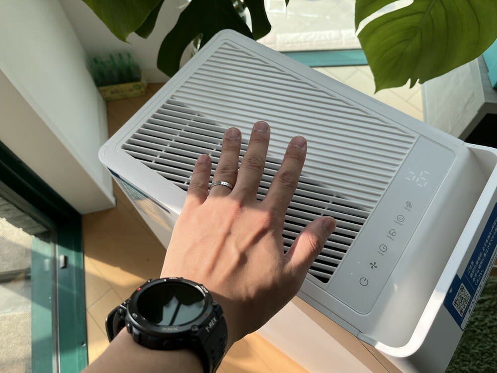 稼働中は上部の排気口から少し暖かい風が吹き出てくる。最も弱い出力モードでも、そこそこ強力な風が吹き出てきて、周囲がみるみるうちに乾燥していくのが伝わってくる。
