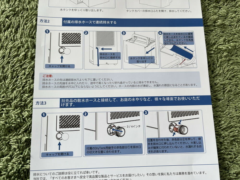 なお、前述した通り、付属のドレンホースを本体側面の連続排水口に接続することで、除湿しながら排水を行う(連続排水する)ことも可能だ。