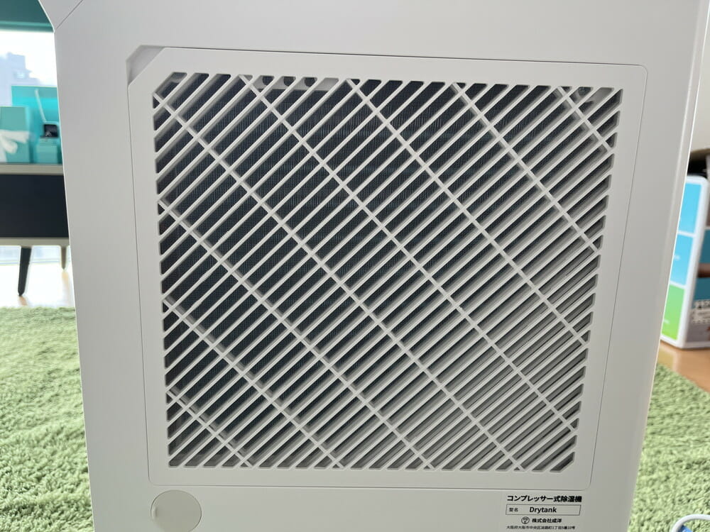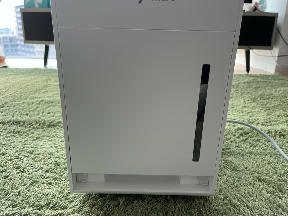 ▼正面下部には水タンクが内蔵。除湿された空気中の水分がここに溜められる。