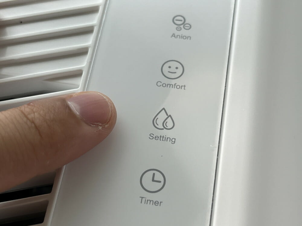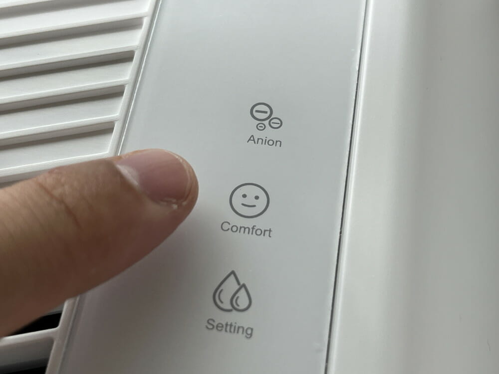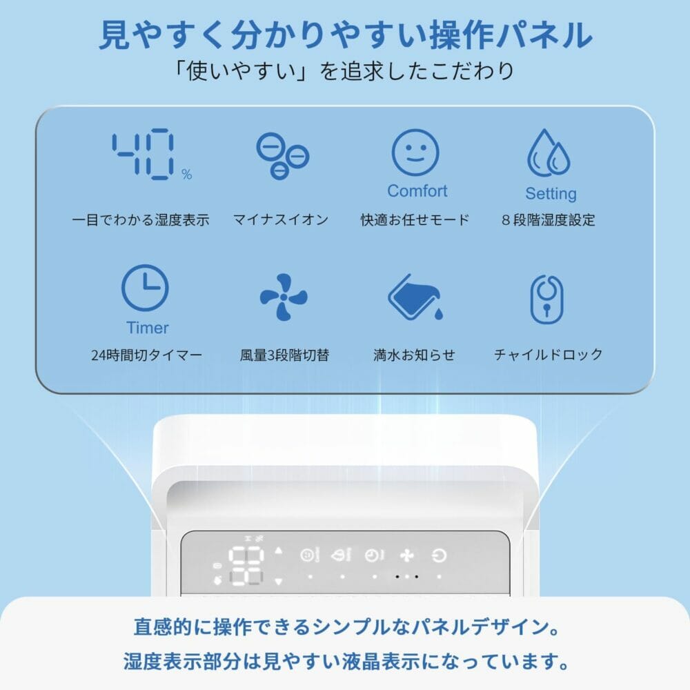 手動での湿度コントロール機能も搭載しており、5%刻みで40〜80%の範囲で適切な湿度に設定できる。便利な切タイマー付きで、0〜24時間の範囲で、1時間刻みでオフタイマー設定が可能だ。