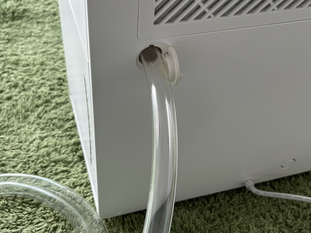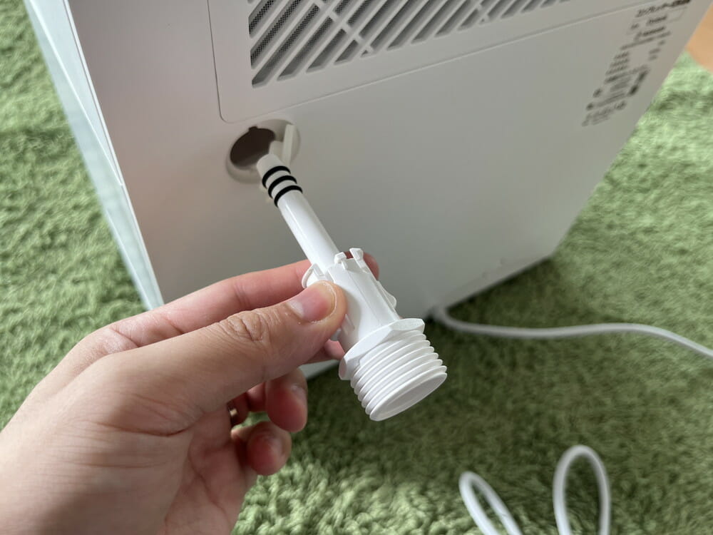 ▼付属のドレンホースを装着したまま運転することで、除湿した水を連続排水できる。長時間の連続稼働時にはオススメの方法だ。