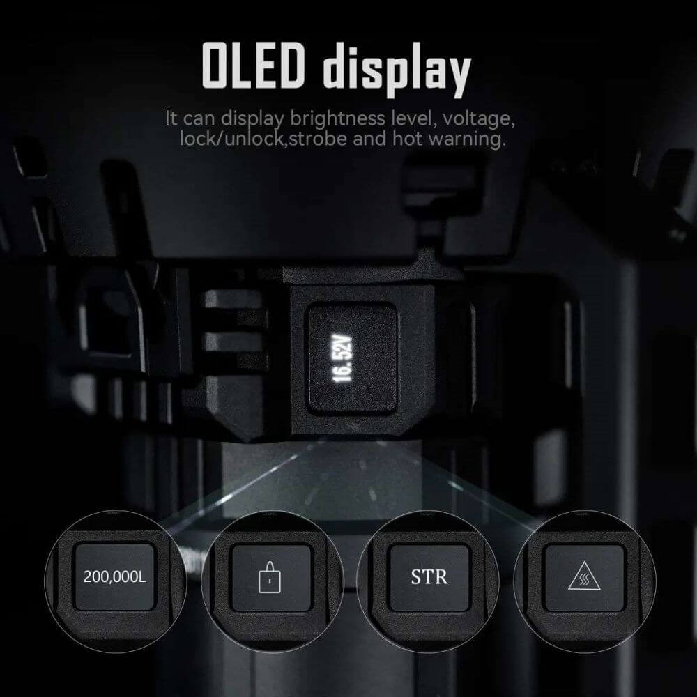 筐体に搭載されたOLED ディスプレイには、現在の発光モードと残りの使用可能時間が表示される。交換可能なバッテリー パックは、Type-C PD100W 超高速充電器を使用した場合、急速充電によりわずか2時間で満充電を完了できる。