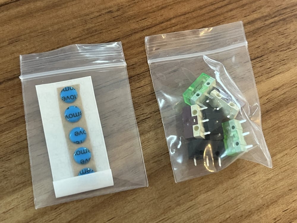 ▼交換用マイクロスイッチに加え、マウスフィートとセンサー保護シールも同梱されている。