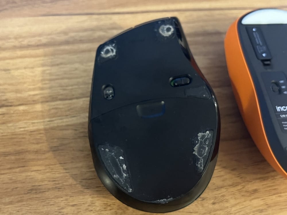 ▼筆者が普段使用しているマウス(黒)との底部の比較。