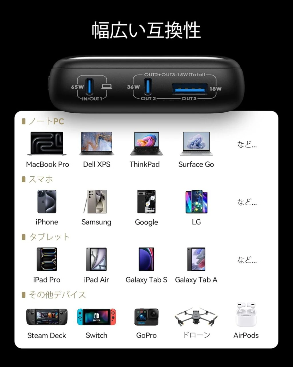 | 出力 | ・USB Type-C1:最大65W ・USB Type-C2:最大36W ・USB Type-A:最大18W |