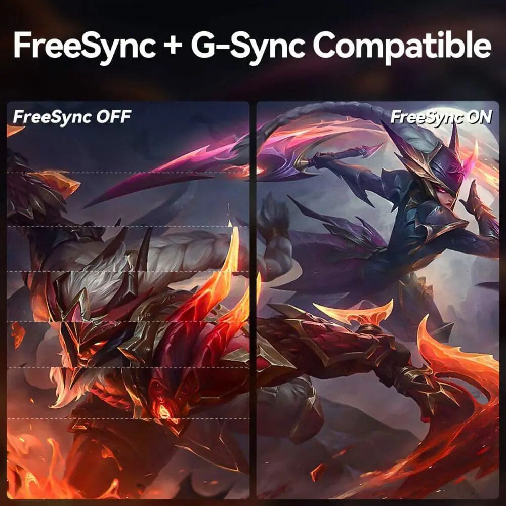 FreeSync + G-Sync Compatible設計により、画面のリフレッシュレートとコンテンツのフレームレート間のずれによって生じるティアリングを回避し、カクつきを減らすことが出来る。