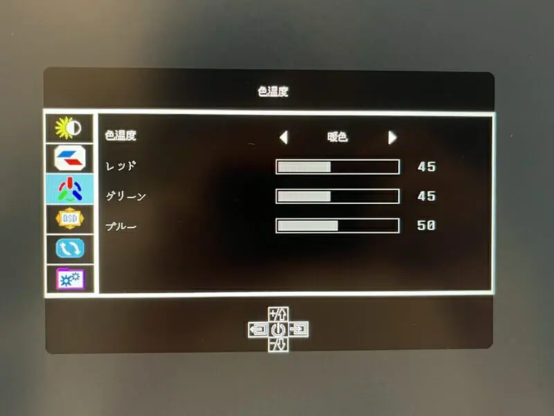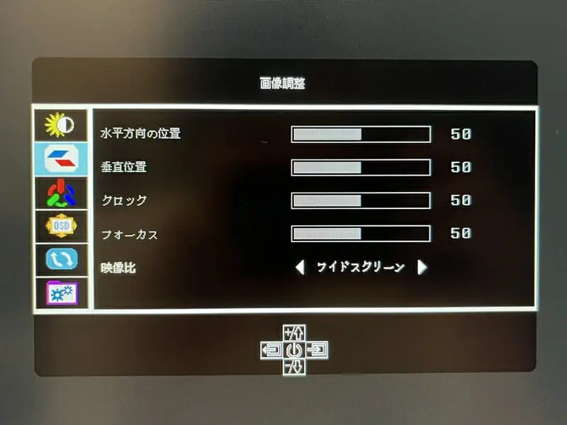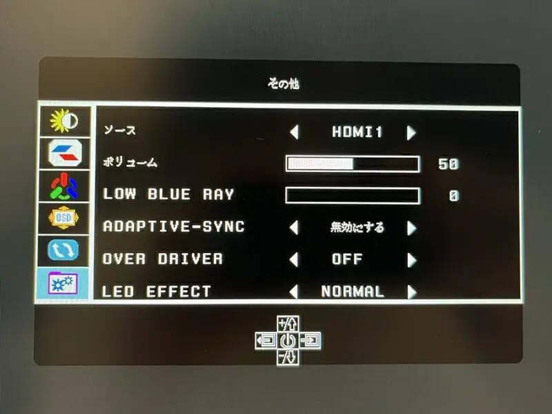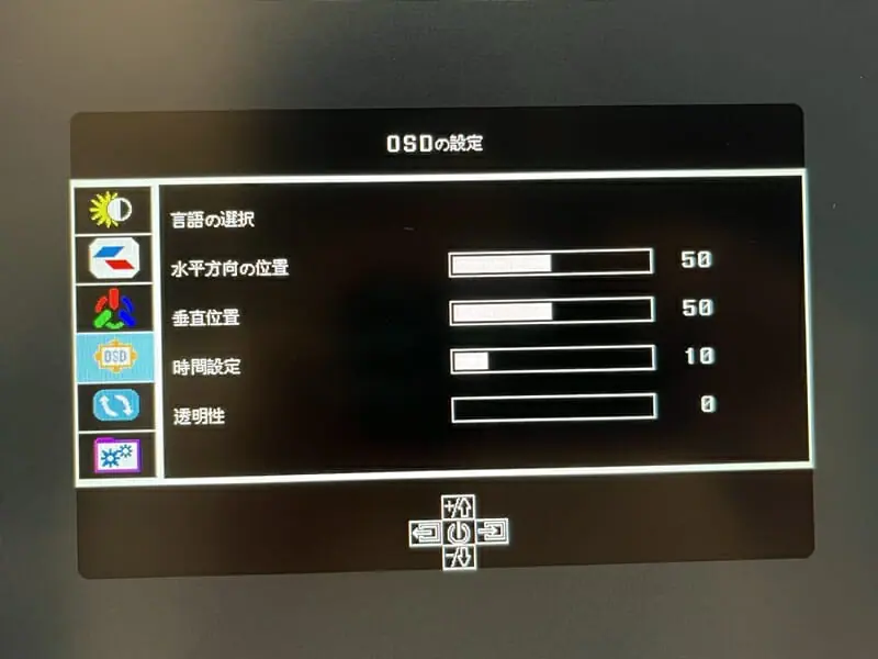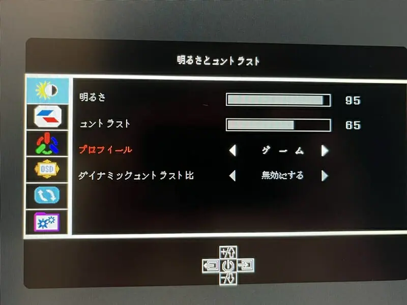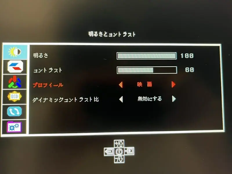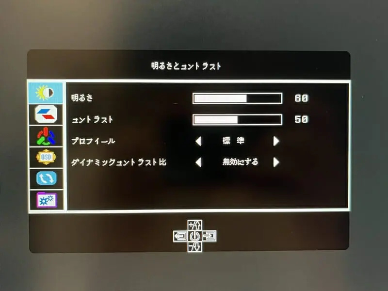オプション画面では、明るさやコントラストと言った一般的なモニター設定が用意されている。