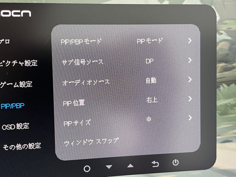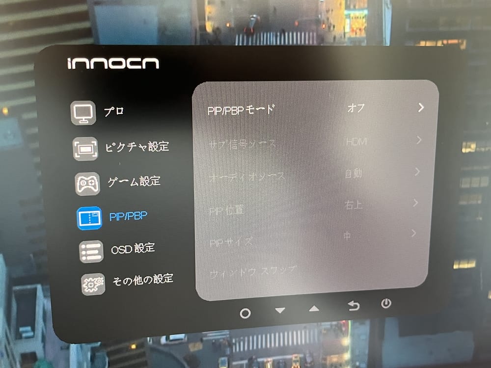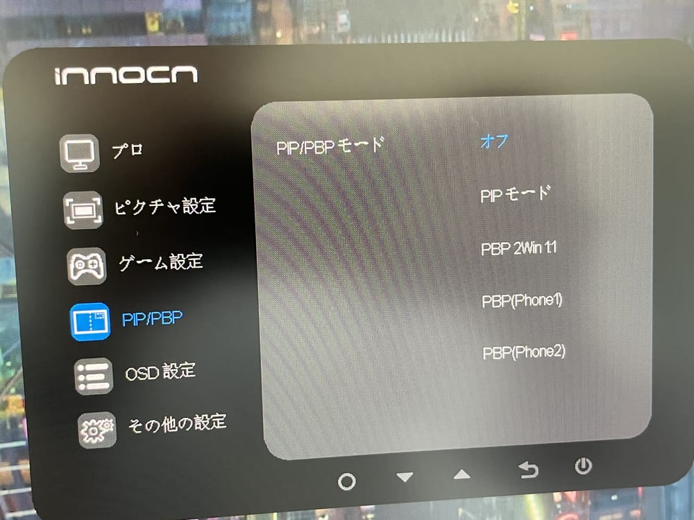 メニュー画面より、前述した『PBP』『PIP』機能を利用することで、接続デバイス2台の映像を、一度に同時出力することが可能だ。
