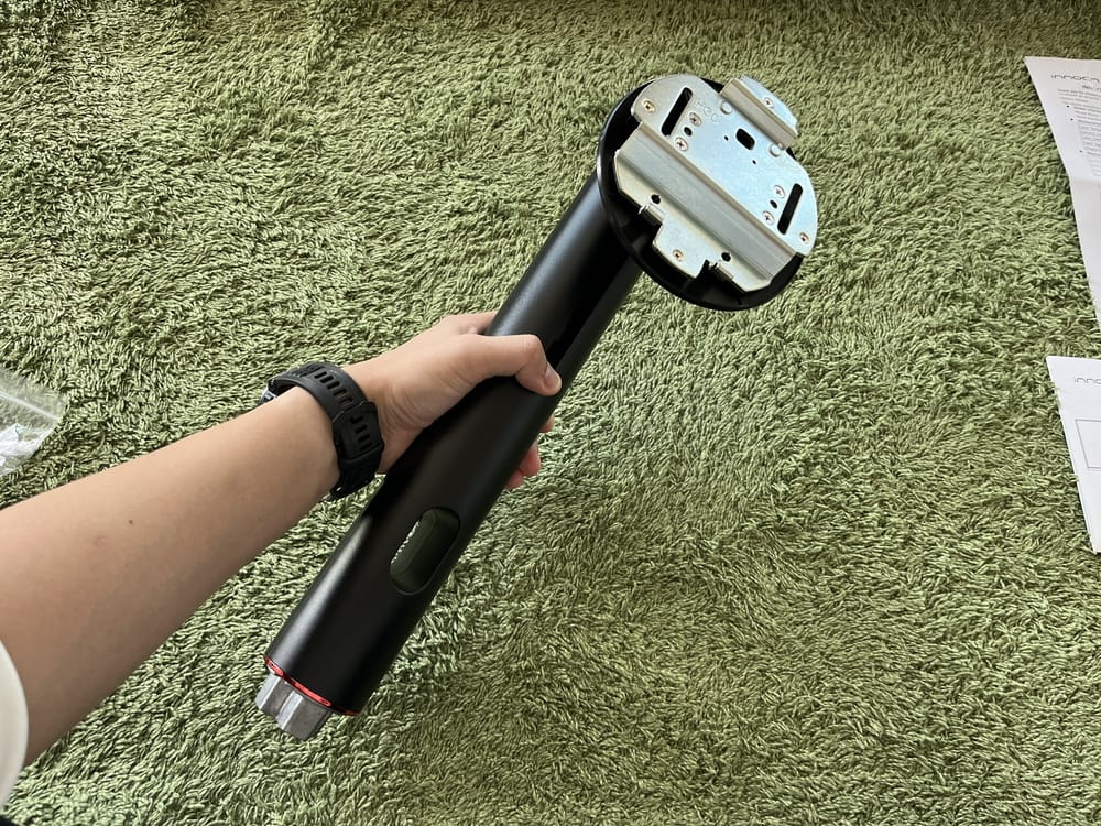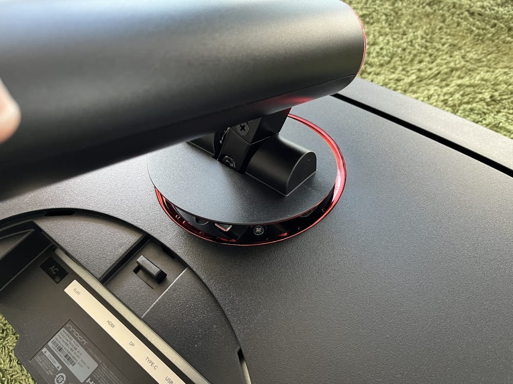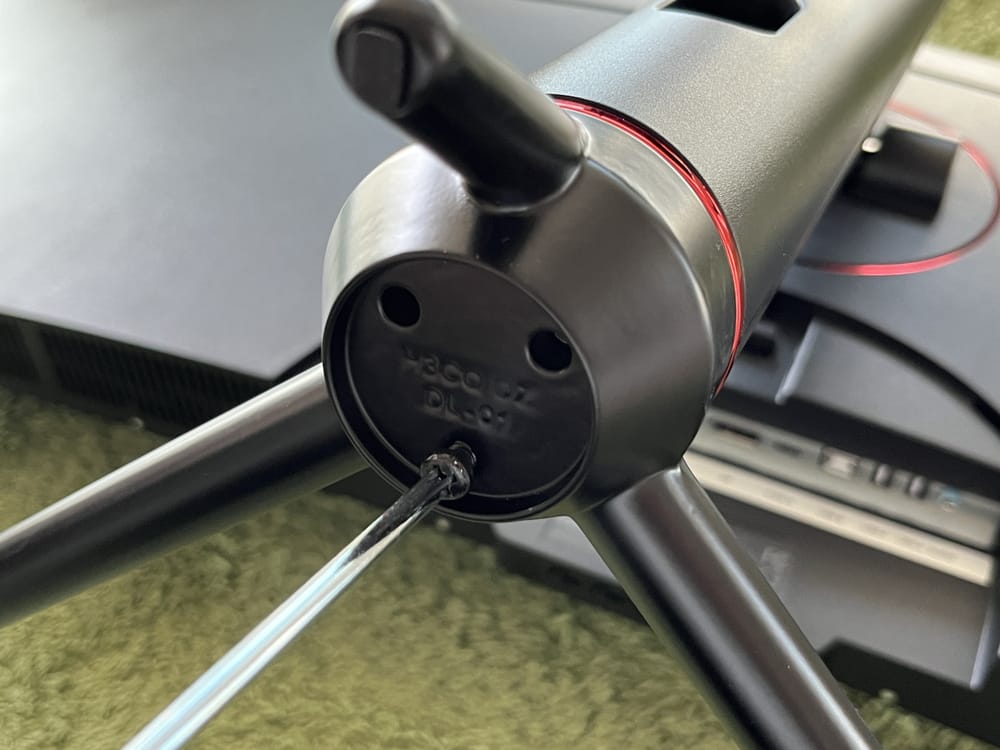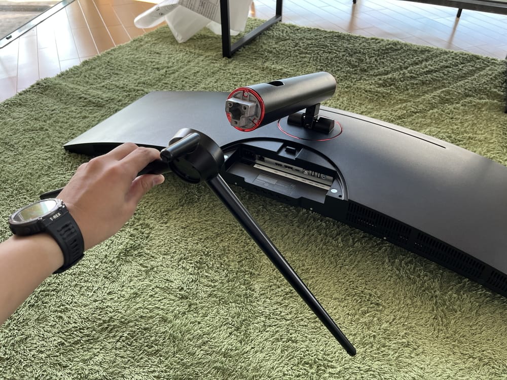 続いてスタンド下部にベースを挿入し、付属のビス&ドライバーを用いてしっかりと固定する。