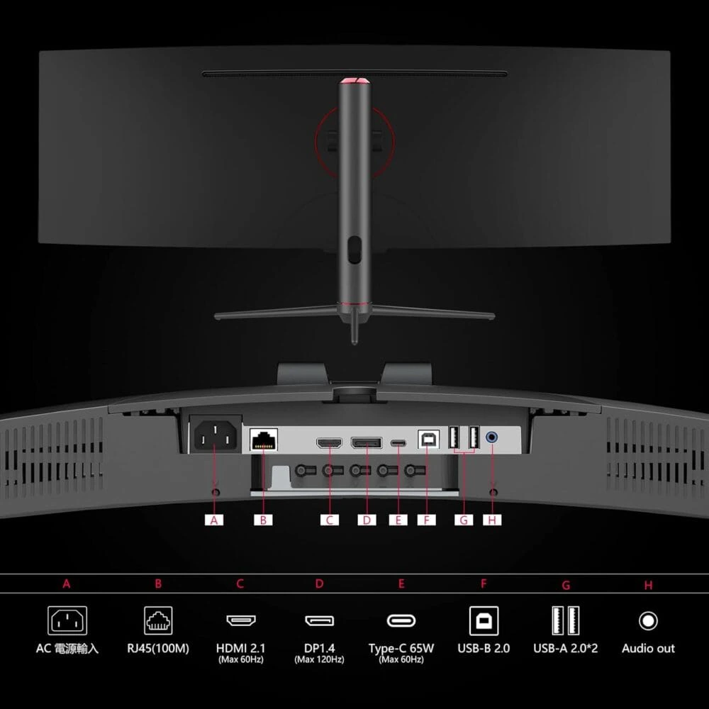 | インターフェース | ・Display Port 1.4×1(最大120Hz) ・HDMI 2.1×1(最大60Hz) ・USB Type-C×1(最大60Hz)(最大65W給電対応) ・USB Type-B×1 ・USB Type-A×2 ・LAN(100Mbps)×1 ・3.5mmステレオミニジャック×1 |
