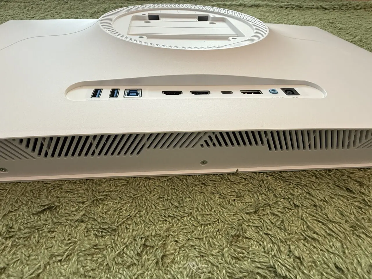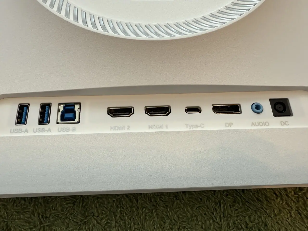 背面下部にはポート類が集約。画像左からUSB-A ×2、USB-B(アップストリーム)、HDMI 2.1 ×2、USB Type-C(映像出力・データ転送・最大90W給電対応)、DisplayPort 1.4、3.5mmオーディオジャック、DC電源ポートが用意。