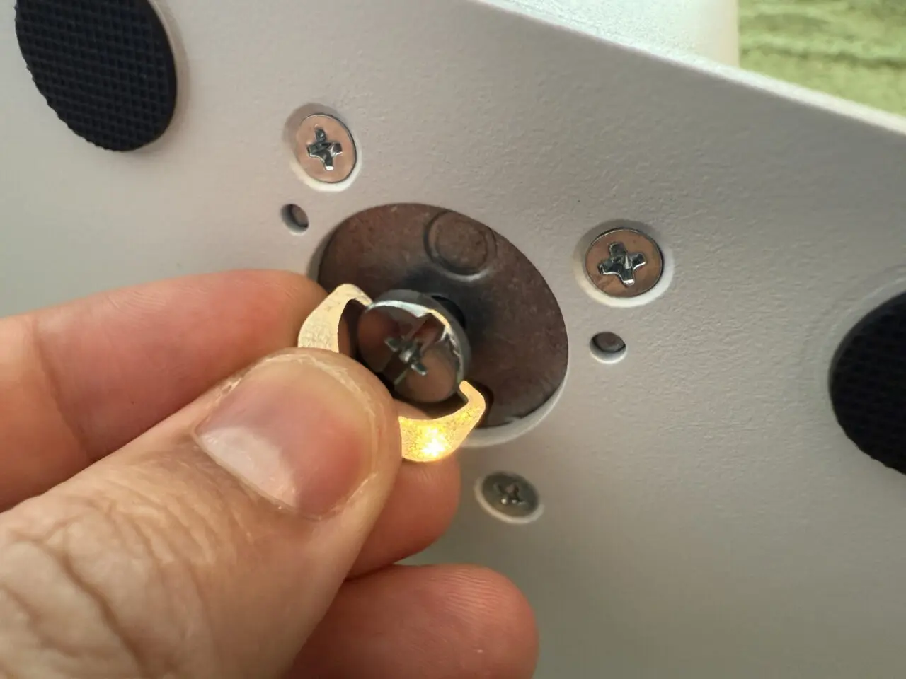 INNOCN GA27V1Mのベース下部のネジを指で摘まんでいる様子